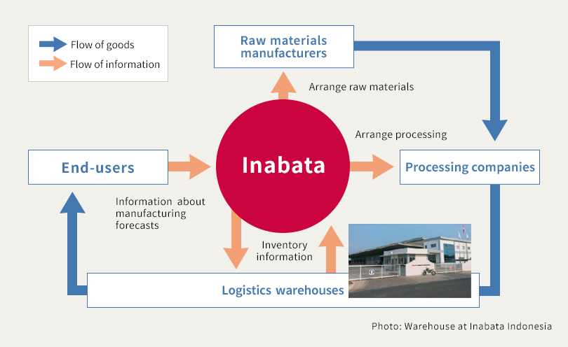 VMI 是 熊猫比分官网入口 代表客户管理和补充库存的系统。我们利用IT分析客户的生产信息,并与多个供应商和分销商协调,高效地为客户提供材料。例如,为了满足客户对及时交货和一站式服务的需求,我们于2017年开始在印度尼西亚运营自己的汽车零部件和树脂材料中心。由于客户便利性的提高,我们的交易量稳步增长,并且我们在 2019 年扩大了存储设施。展望未来,我们计划提供新产品。